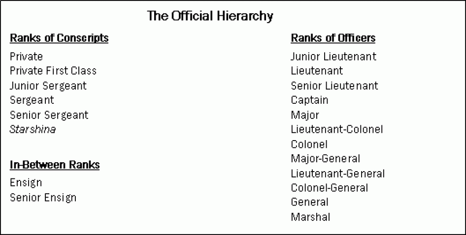 Konstantin Bannikov, the author of the most in-depth sociological study of dedovshchina to date, has observed that the informal status of conscripts is far more important for them than their official military ranks, "[b]ecause the former, not the latter, determine the life of the person in the army and his place in the group."[30] Indeed, dedovshchina dominates every aspect of the life of the first-year conscript.