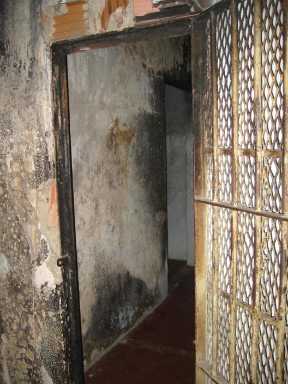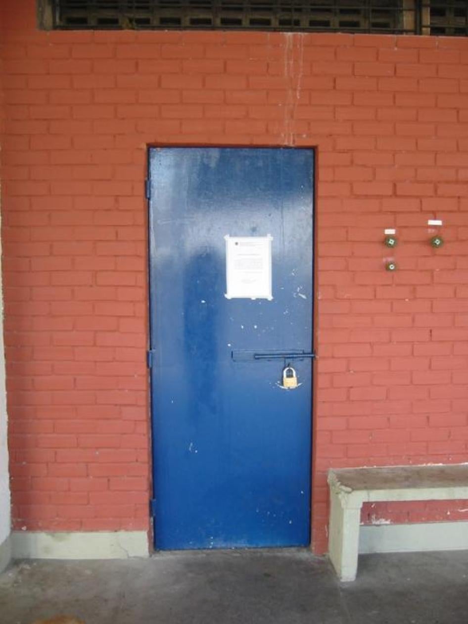 During a surprise inspection in July 2003, prosecutors discovered thirteen youths in this dimly lit, poorly ventilated Padre Severino punishment cell, viewed here from the outside. Locked inside for days in close quarters, the youths slept on the concrete floor with no mattresses or bedding.