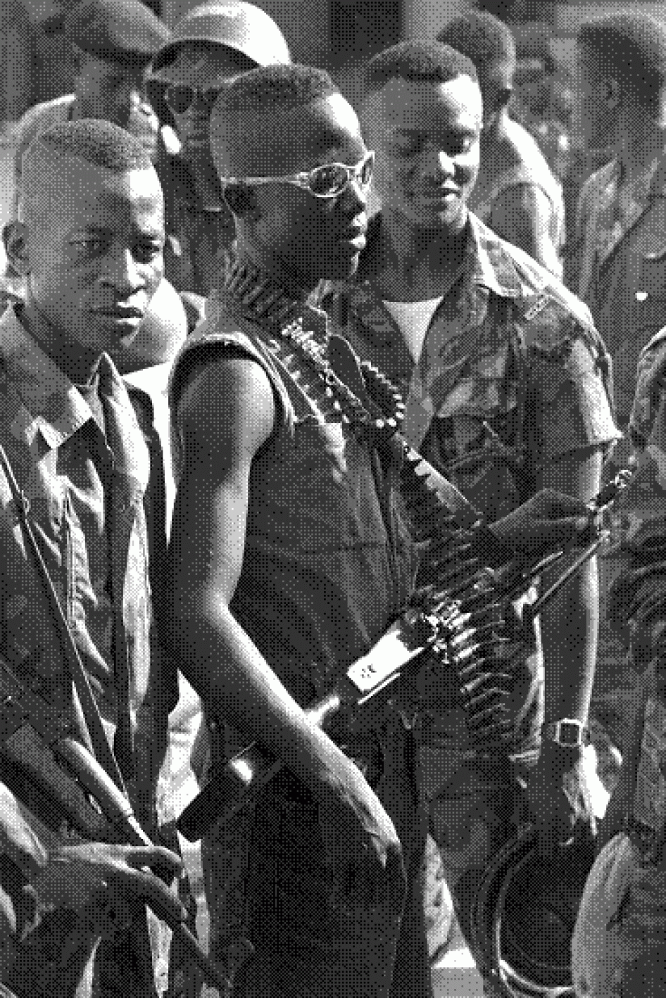 Rebels from the Revolutionary United Front (RUF) and Armed Forces Revolutionary Council [AFRC] patrol through the streets of Freetown, Sierra Leone shortly after a coup in May 1997 which overthrew democratically elected president Tejan Kabbah. Many Liberian fighters joined up with the joint RUF/AFRC forces during their nine months in power. © 1997 Corinne Dufka