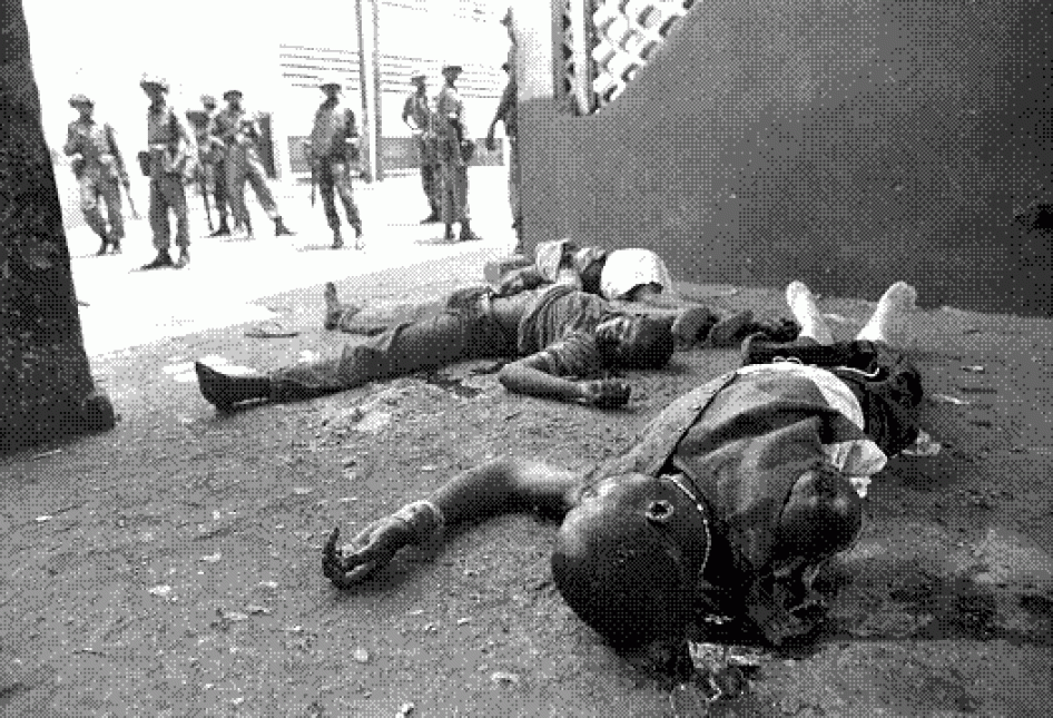 Nigerian peacekeepers patrol by the bodies of several NPFL fighters who were killed during clashes with ULIMO-J during two months of clashes between the two groups in April – May 1996. Hundreds of civilians were killed and thousands more wounded during the fighting. © 1996 Corinne Dufka