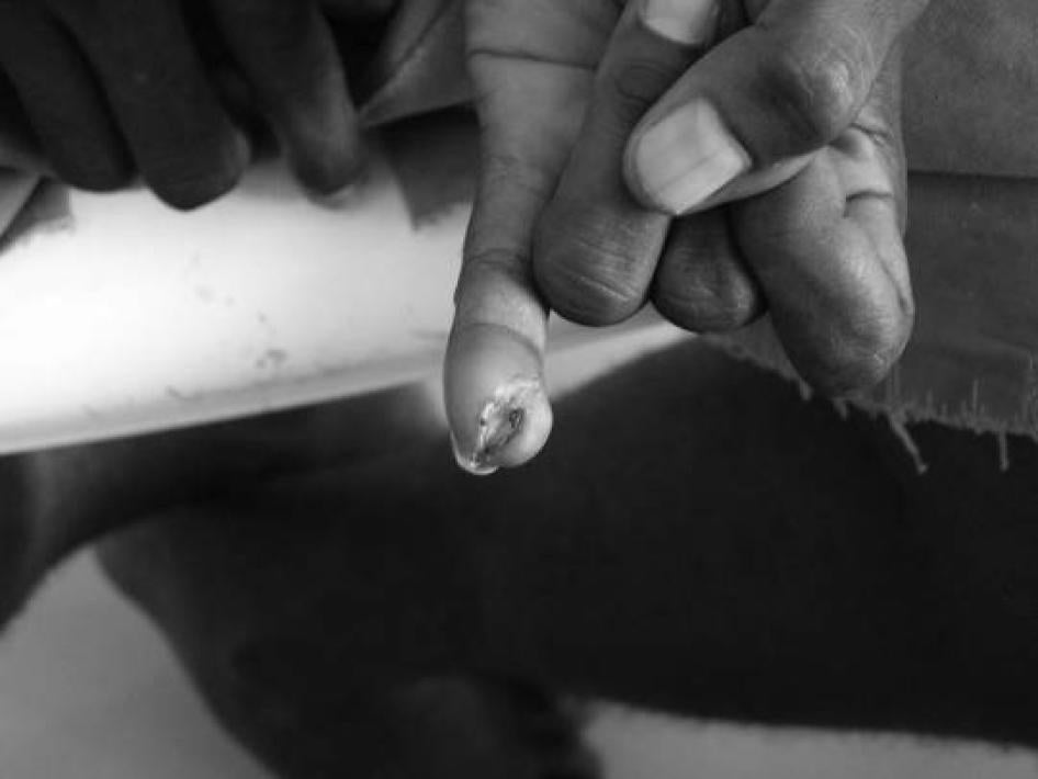 First they cut me with the scissors. They put the scissors there [indicating his back and right side] and cut my skin.