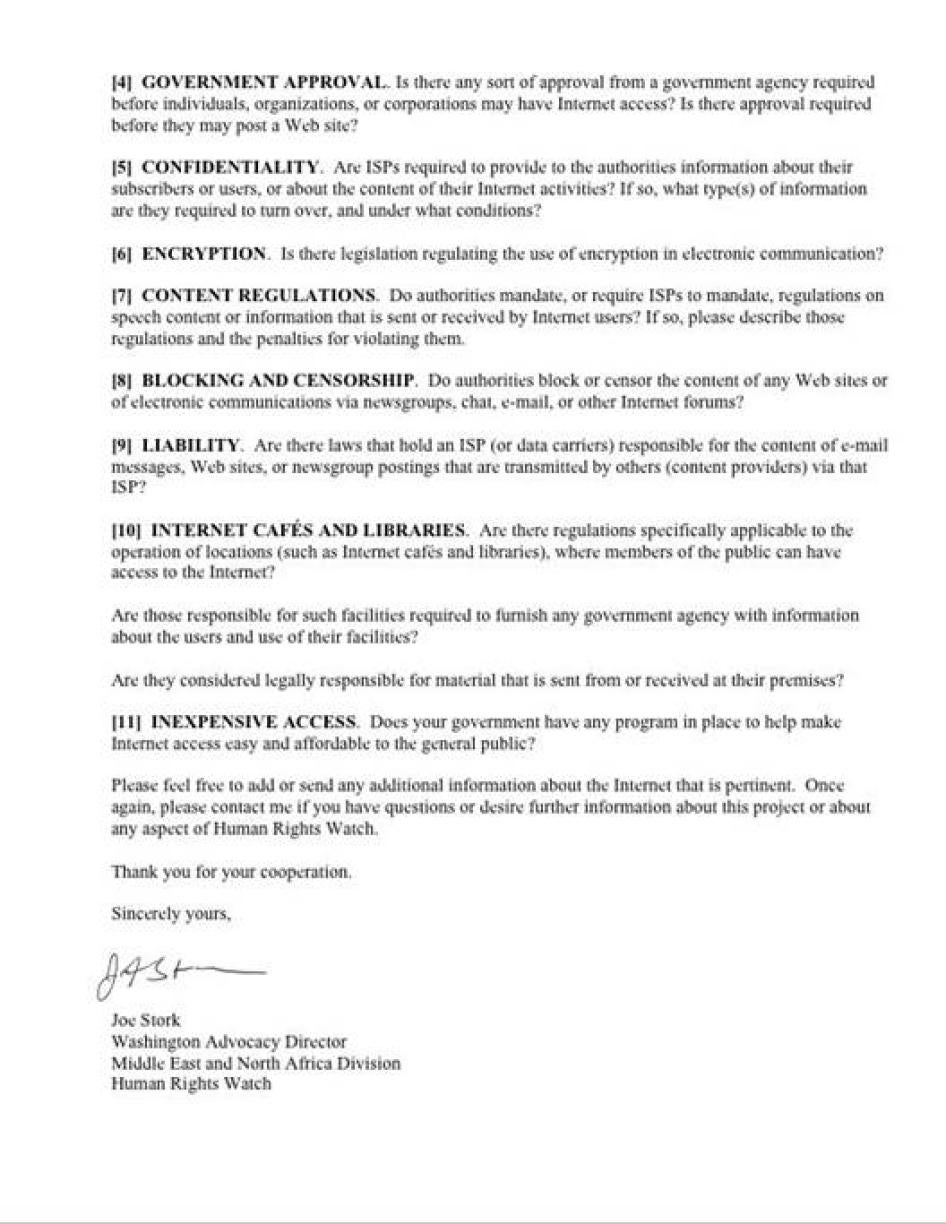 In 1999, Human Rights Watch sent a uniform letter containing questions about Internet policies to seventeen regional governments. The official responses to that query were reproduced and analyzed in Human Rights Watch's 1999 report, The Internet in the Mideast and North Africa.[17]