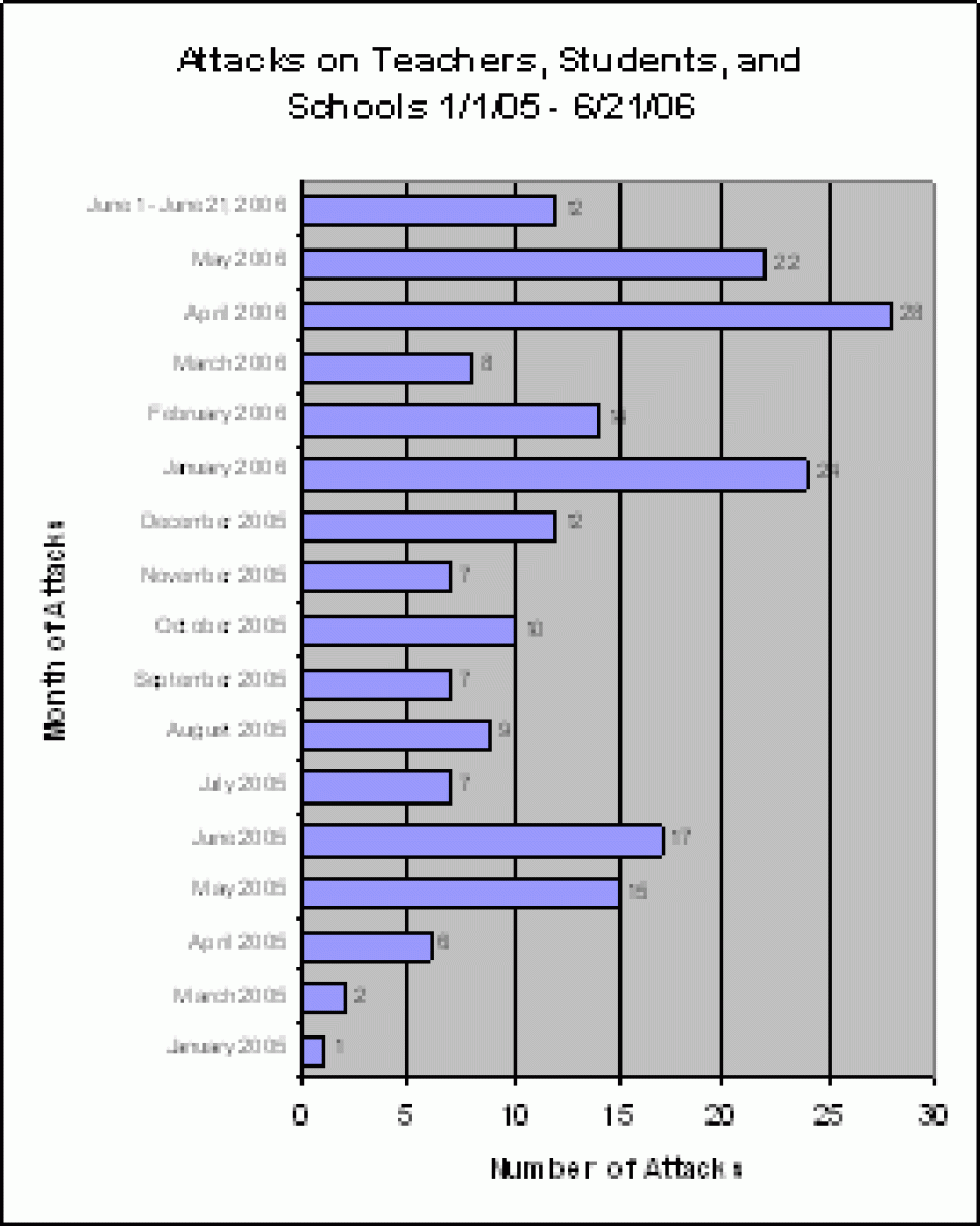 Attacks on all aspects of the education process sharply increased in late 2005 and the first half of 2006. As of this writing, more attacks have been reported in the first half of 2006 than in all of 2005. Previously secure schools, such as girls' schools in Kandahar city and in northernprovinces such as Balkh, have come under attack. There have been reports of at least seventeen assassinations of teachers and education officials in 2005 and 2006; several are detailed below. This report also documents more than 204 attacks on teachers, students, and schools in the past eighteen months (January 2005 to June 21, 2006).