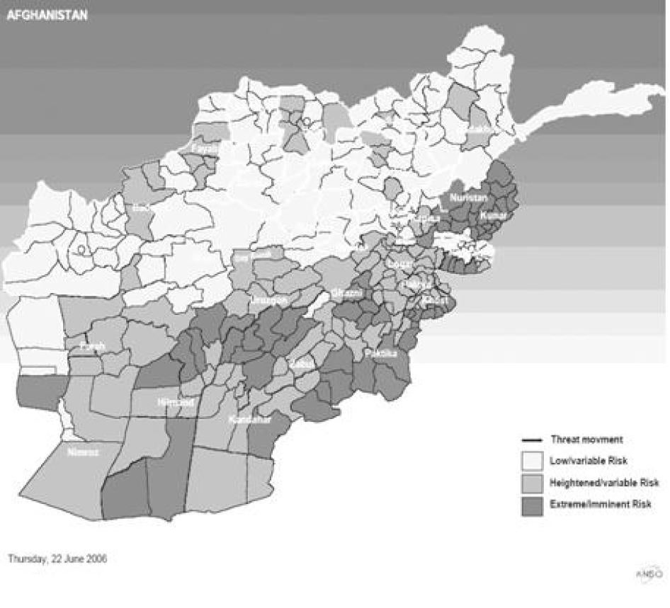 Afghanistan NGO Safety Office map of insecure areas, June 15, 2006. 2006 ANSO