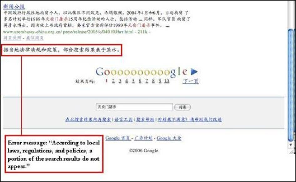 Google: In January 2006 Google rolled out its censored search engine, Google.cn. Google.cn does provide notice to users when search results have been censored but provides no further details. The company announced that it would not provide email or blog-hosting services in China, at least for now, in order to avoid being pressured to cooperate with Chinese police in handing over user data as in the case of Yahoo!, and to avoid having to directly censor user-created content as in the case of MSN Spaces. Google justified its censored search engine by arguing that users could rely on Google.com for uncensored searches; however, Chinese Internet users have reported widespread blockage of Google.com by Chinese ISPs. Human Rights Watch testing shows that the censored Google.cn, while denying access to the full range of information available on the World Wide Web, still enables the Chinese user to access substantially more information on sensitive political and religious subjects than its Chinese competitors. (See Appendix X for letter sent by Human Rights Watch to Google regarding company practices in China.)