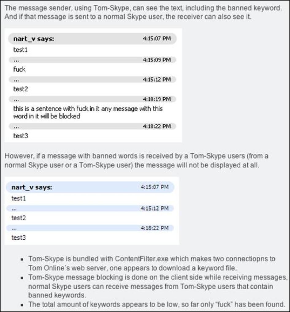 [152] Nart Villeneuve, "Tom-Skype Filtering in China," blog, Internet Censorship Explorer (ICE), June 15, 2006 [online], http://ice.citizenlab.org/?p=219 (retrieved July 12, 2006).