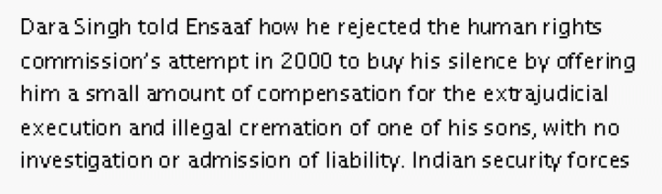 [370]Jaskaran Kaur, "A Judicial Blackout: Judicial Impunity for Disappearances in Punjab, India," Harvard Human Rights Journal, vol. 15 (2002), pp. 287, 289.