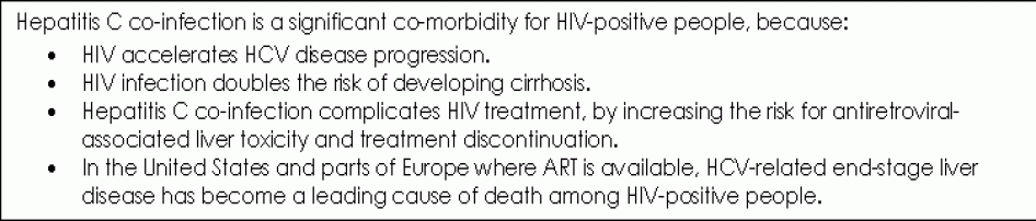 Viral hepatitis and tuberculosis should be addressed as components of HIV treatment and care. Co-infection with hepatitis B, hepatitis C, and/or tuberculosis is common among HIV-positive injection drug users. Healthcare workers providing HIV/AIDS treatment to drug users must understand the dynamics of co-infection with HIV and hepatitis B, hepatitis C, and tuberculosis, and be trained to provide appropriate diagnostics, treatment, and monitoring for these conditions.