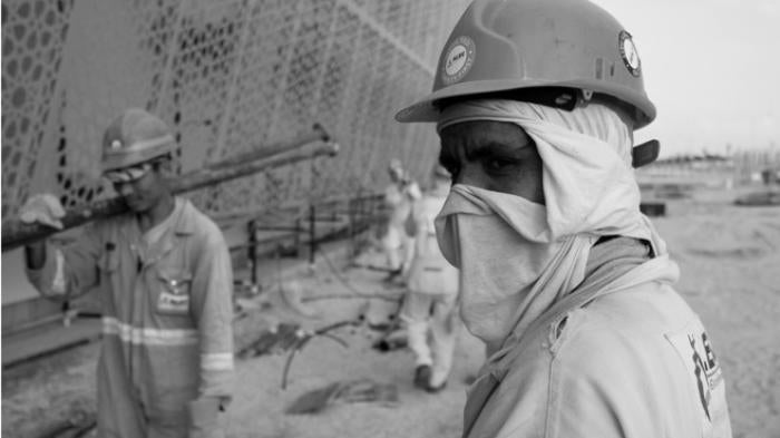 Drawn by the promise of jobs in the United Arab Emirates (UAE), thousands of men from India, Pakistan, Bangladesh, Sri Lanka, Nepal, and Thailand are working on Saadiyat Island. Workers spend up to 12 hours per day on their worksites, often in extreme conditions of heat and humidity with temperatures often exceeding 100 degrees Fahrenheit (38 degrees Celsius). Some workers have been on Saadiyat Island for more than two years, working on massive infrastructure projects, including raising the island's level by trucking in sand and building 10-lane highways and bridges.