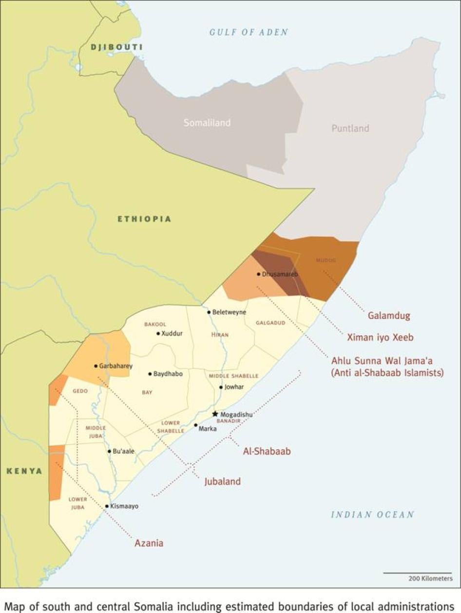 The forces involved in the offensive against al-Shabaab are a mix of regular TFG troops and different allied militias. In the Gedo province, TFG forces together with Ahlu Sunna Wal Jama’a and other local militias, backed by Ethiopian armed forces, have taken control of large areas (see map) including the provincial capital, Garbaharey, meeting little resistance.[20] In Lower Juba, Kenyan-trained militias and TFG forces backed by Kenyan artillery have confronted al-Shabaab in fierce fighting around Dhobley and Bula Hawo.