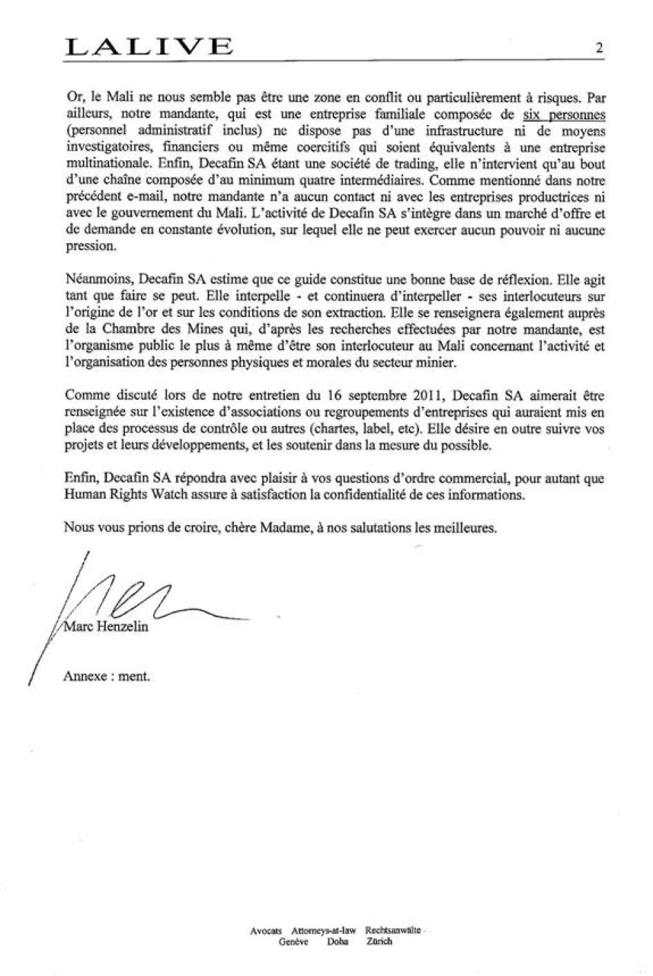 [371] Letter from Marc Henzelin, Lalive, to Human Rights Watch, August 10, 2011 (translated by Human Rights Watch). See the Human Rights Watch letter and the full response in Annex III.