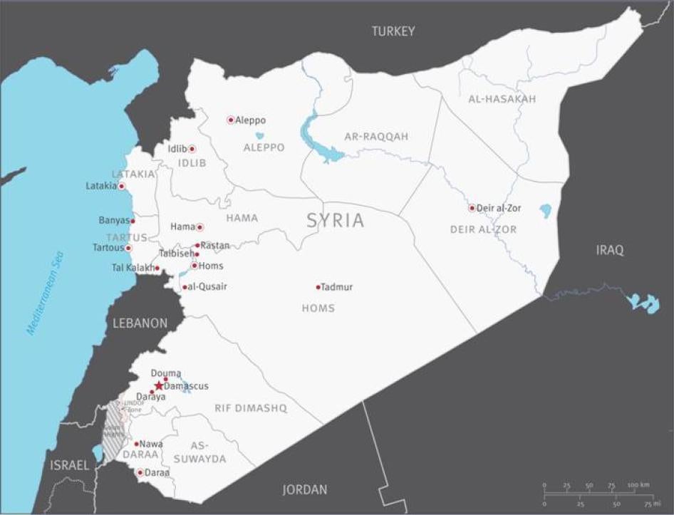 This report focuses on the individual and command responsibility of Syrian military commanders and intelligence officials for these crimes. It is based on interviews with 63 defectors both from the army and from the intelligence agencies, generally known as the mukhabarat. These defectors shared with Human Rights Watch detailed information about their units’ participation in violations and the orders they received from commanders at different levels. The defectors provided information on violations that occurred in seven of Syria’s fourteen governorates: Damascus, Daraa, Homs, Idlib, Tartous, Deir al-Zor, and Hama.