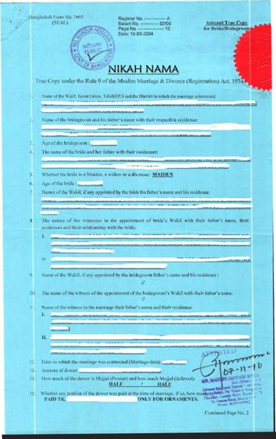[346] Convention on Consent to Marriage, Minimum Age for Marriage and Registration of Marriages, adopted November 7, 1962, G.A. res. 1763 (XVII), entered into force December 9, 1964, http://www2.ohchr.org/english/law/convention.htm (accessed August 17, 2011), art. 3. Bangladesh acceded to this convention on October 5, 1998.