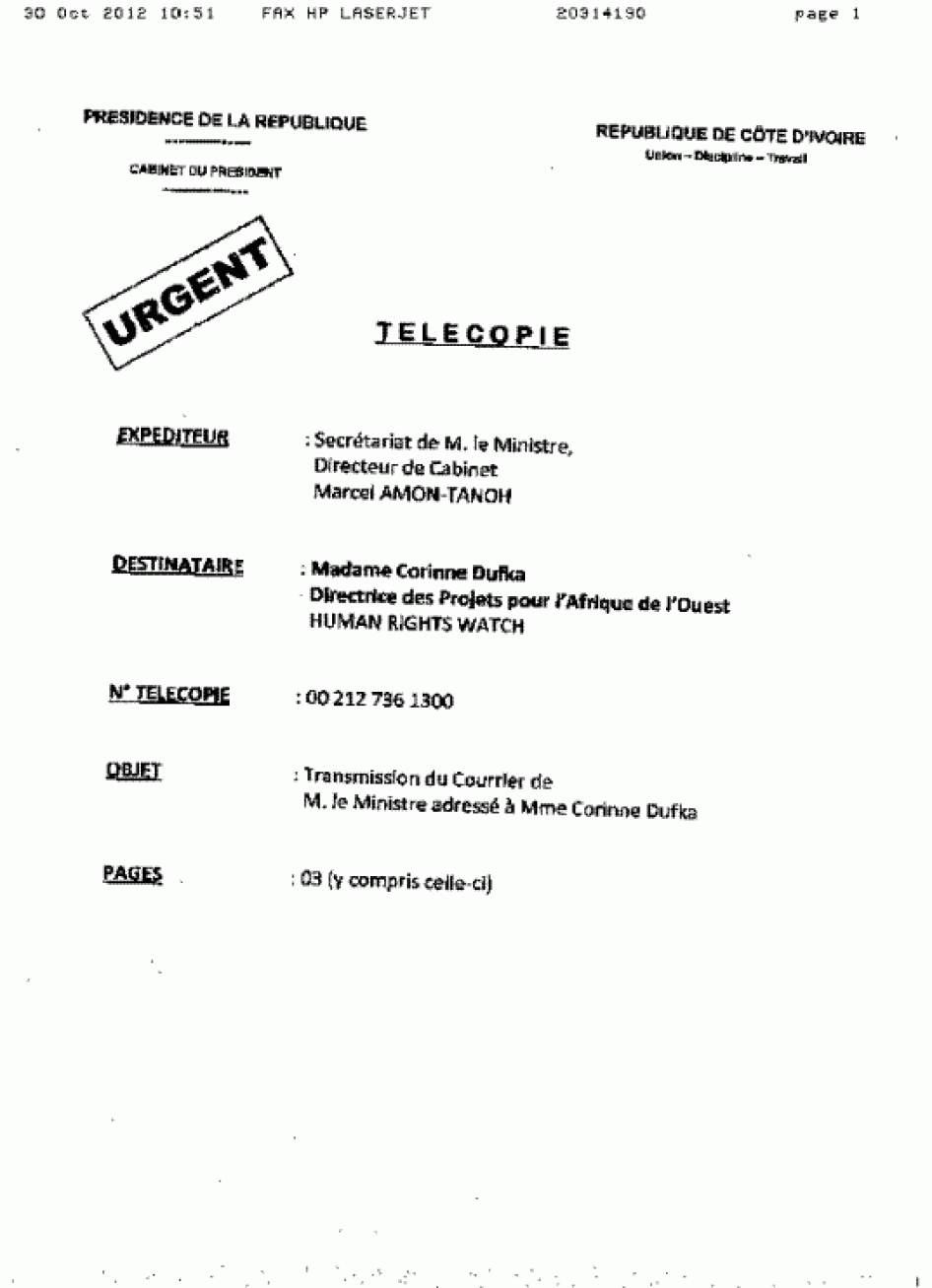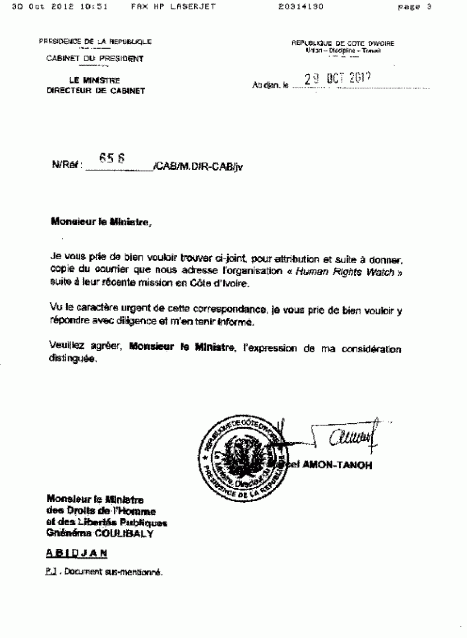 Human Rights Watch also wrote to Marcel Amon-Tanoh, chief of staff in the Ivorian presidency, on October 8, detailing the report’s main findings and asking for an official government response (see Annex I). Mr. Amon-Tanoh forwarded the request to the minister of human rights and public liberties (see Annex II), who responded to Human Rights Watch on November 1. Human Rights Watch has incorporated the government’s answers into the report body and has also included the entire response in Annex III.