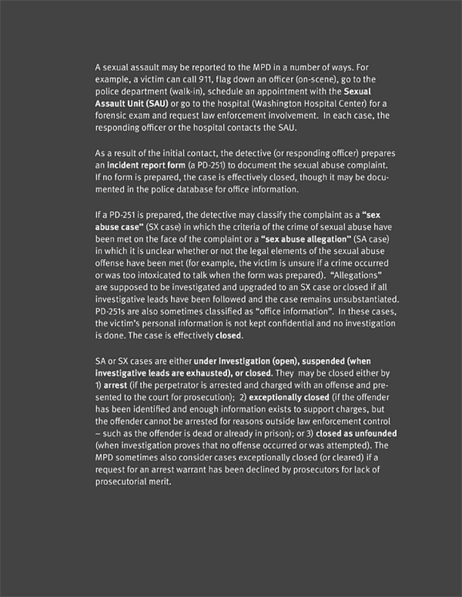 As part of its investigation, Human Rights Watch conducted over 150 interviews and reviewed numerous documents produced by the MPD and other government agencies. These include the Office of Victim Services (OVS) in the Mayor’s Office, which oversees the program for sexual assault victims at Washington Hospital Center (WHC)—the designated hospital for care of adult sexual assault victims in the District.