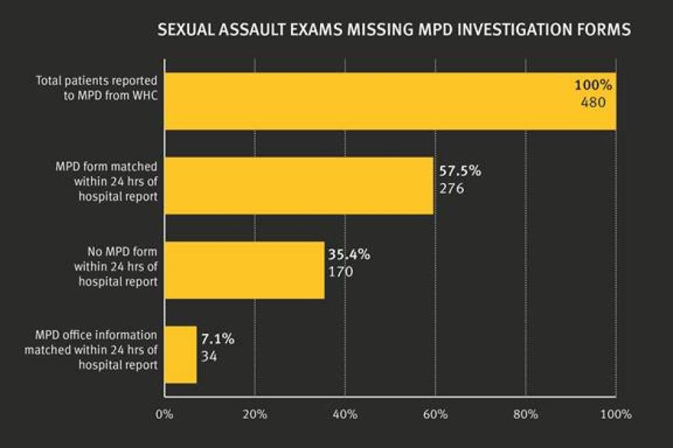 The problem may be even broader than these numbers suggest. Studies of police reports in Illinois and Los Angeles as well as a national sampling of victims indicate that at least 41 percent of victims who report an assault to the police do not get forensic exams. [13] If this trend holds true for D.C. as well, then we would expect the total number of incident reports at MPD to be significantly higher than the number of reports coming through the hospital. However, assuming the Washington Hospital Center data is correct, 436 victims had exams and reported to MPD in the 3 year period analyzed by Human Rights Watch (excluding 44 cases in which the victim reported to MPD at the hospital but did not have an exam). Over the same time period, MPD has 571 incident reports. [14] Even if all the hospital reports were accounted for at the MPD (as previously noted, at least 35.4 percent are not), the total number of reports at the MPD would still be far lower than expected. If approximately 41 percent of people who report to police do not have forensic exams, the number of MPD reports for sexual assault for that period would be expected to be 739 cases, not 571. [15]
