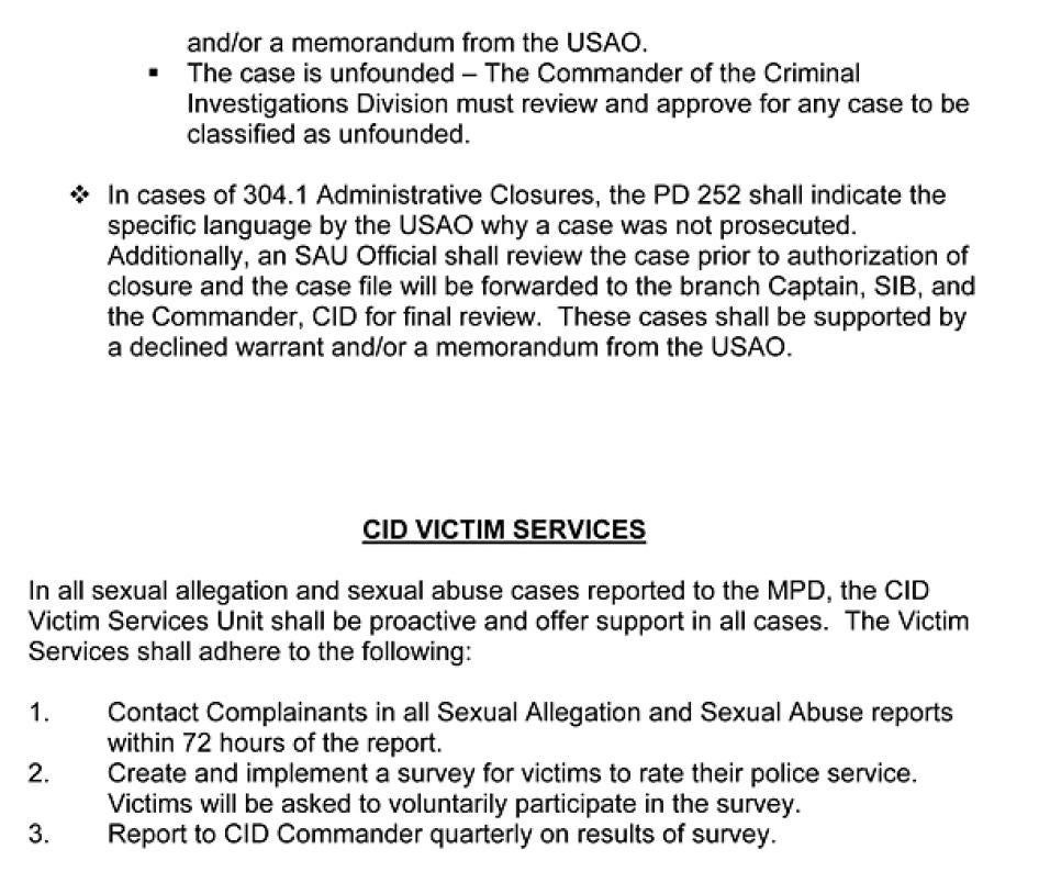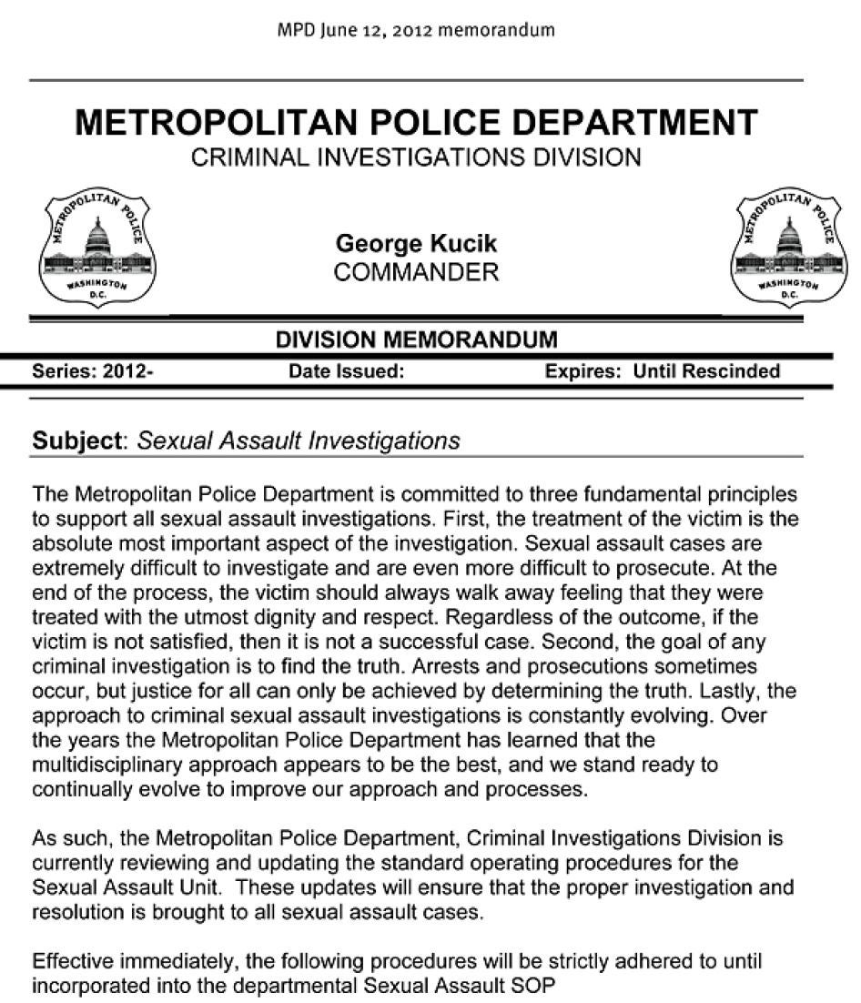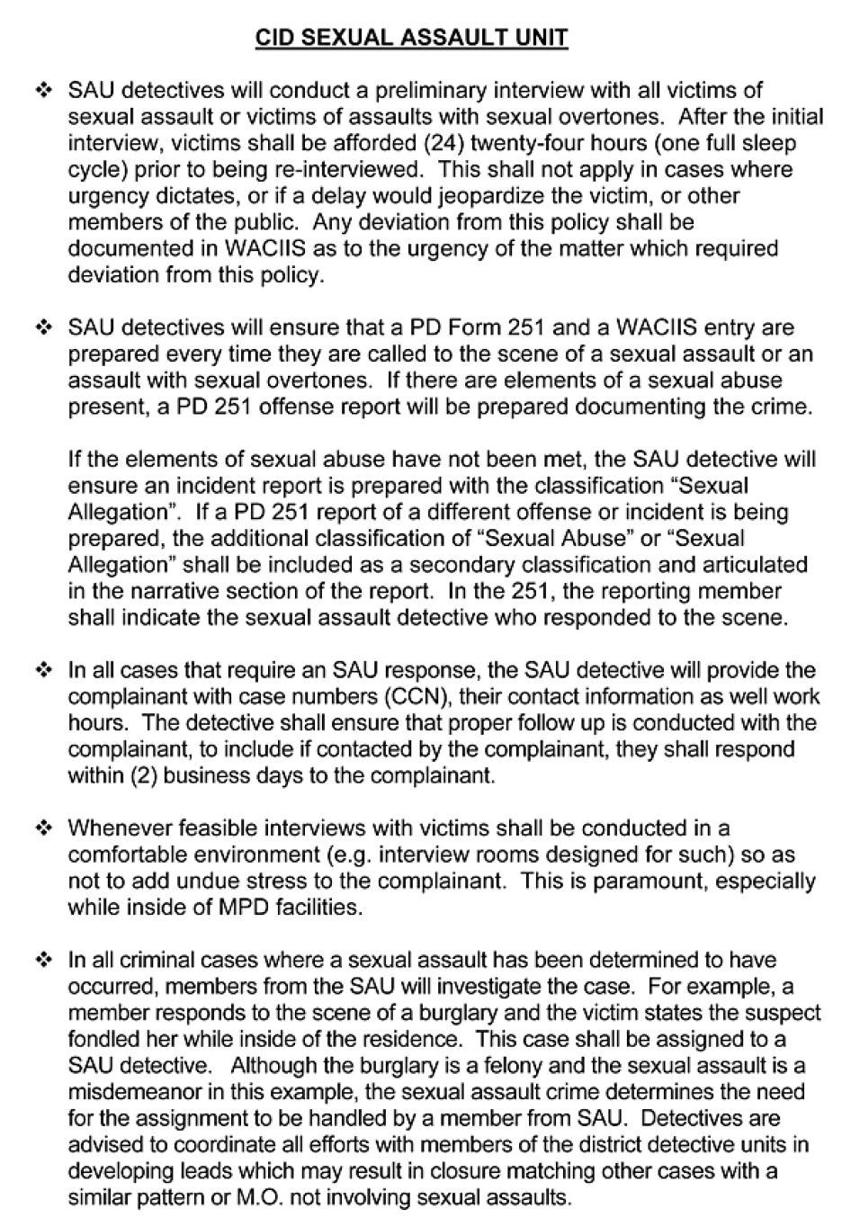 SOP: Standard Operating Procedures for the Sexual Assault Unit. These are the MPD’s guidelines for the investigation of sexual assaults.