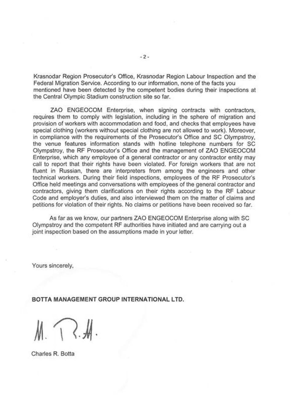 Human Rights Watch received written responses from five companies. Both Botta Management Group, AG, the project manager for the Central Olympic Stadium, and Engeocom Association, the general contractor for the Central Olympic Stadium, responded. Botta Management Group is a Swiss firm specializing in project development for different types of large-scale and complex construction projects, including for the World Cup and the Olympic Games. Engeocom is a Russian construction firm that identifies itself as a leading construction company in Russia specializing in city transport infrastructure, residential structures, and cultural venues.