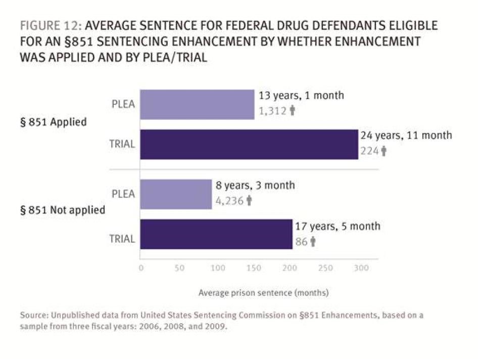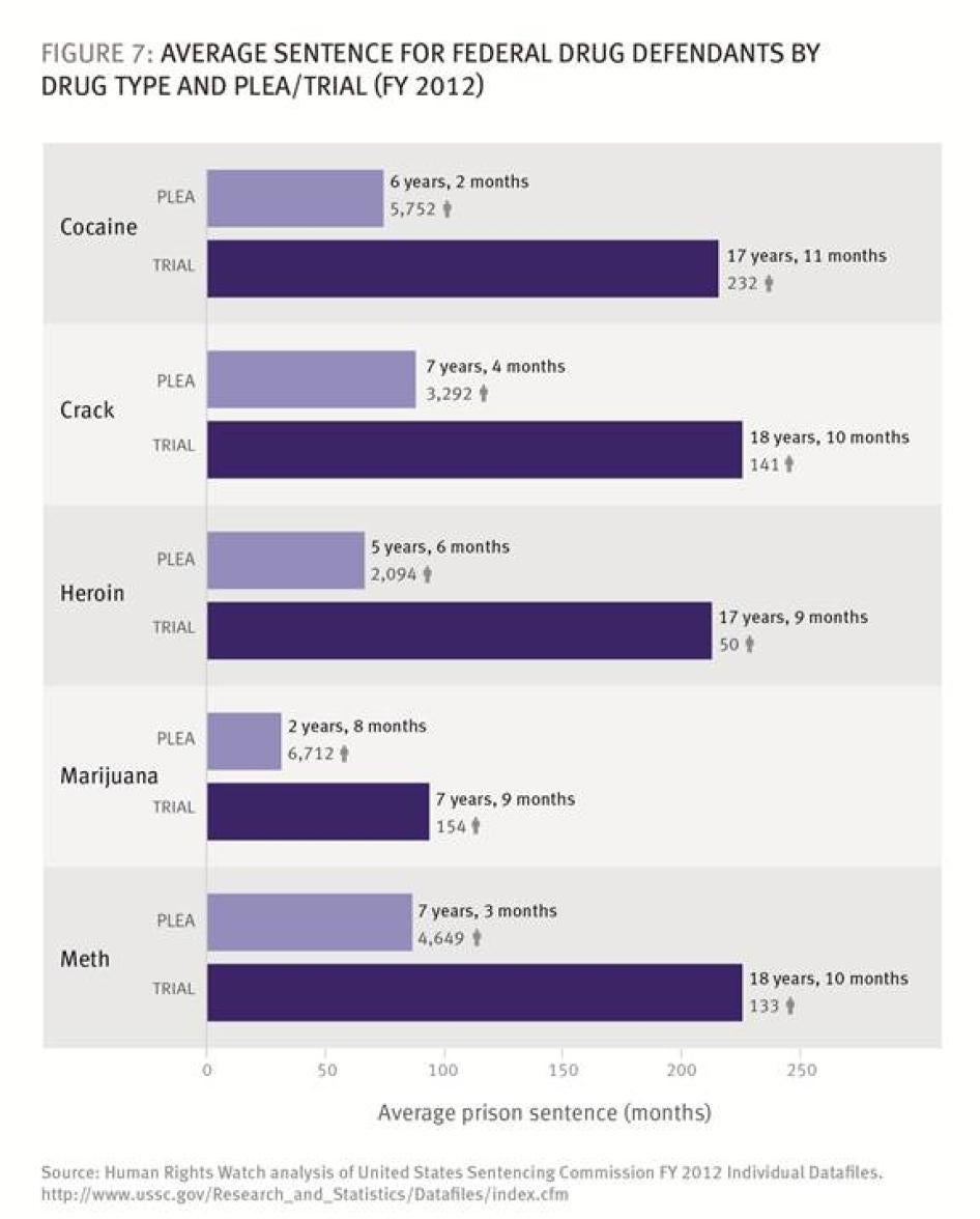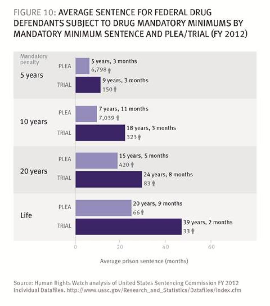 Plea bargaining means higher sentences for defendants who go to trial. In 2012, the average sentence of federal drug offenders convicted after trial was three times higher (16 years) than that received after a guilty plea (5 years and 4 months).
