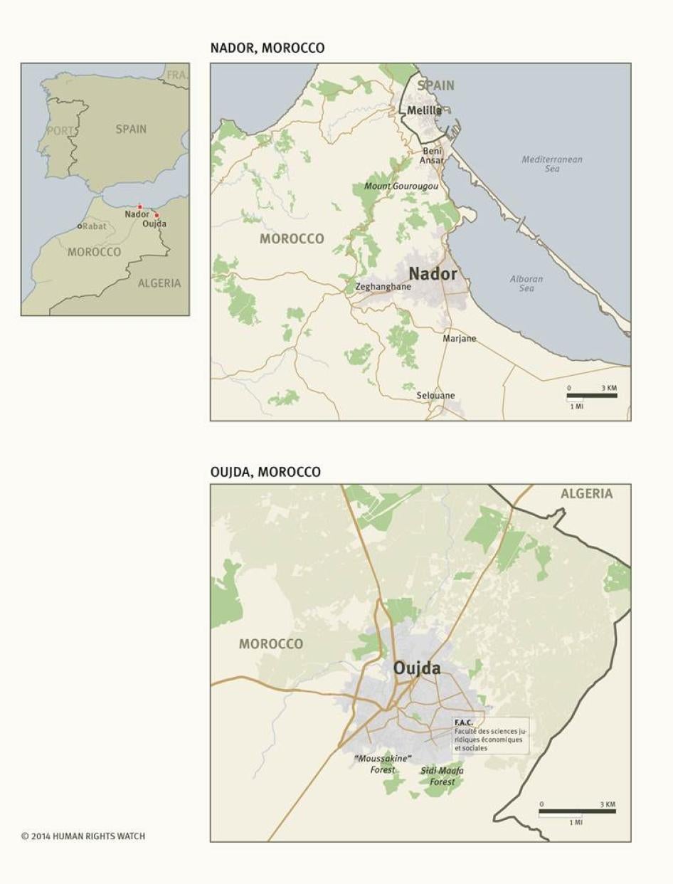 Human Rights Watch has documented cases where Moroccan police beat these migrants, deprived them of their few possessions, burned their shelters, and expelled them from the country without due process. Morocco’s government insists that the police were enforcing national immigration policy and denied that the police perpetrated violence against migrants. However, statements from the migrants, corroborated by other sources, suggested many cases of abuse of sub-Saharan Africans in Morocco. This report focuses on the treatment of sub-Saharan African migrants currently in Morocco’s northeastern region, between the Algerian border and the Spanish enclave of Melilla. Human Rights Watch interviewed 67 sub-Saharan African migrants living in unofficial campsites in this region around the cities of Oujda and Nador in December 2012, and another two sub-Saharan African migrants in Melilla.