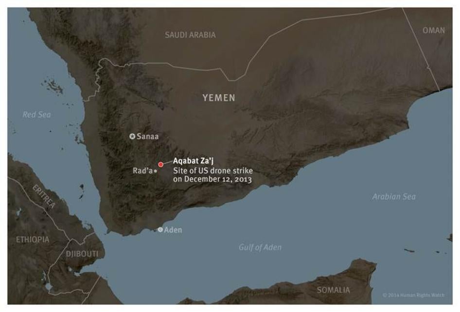 The strike, on December 12, 2013 in Aqabat Za`j, a district northeast of the central Yemeni city of Rad`a, killed at least 12 men ages 20 to 65 and wounded at least 15 others, according to survivors, relatives of the dead, civil society members, and multiple media reports. The relatives said the dead included the son of the groom from his previous marriage. They said shrapnel grazed the bride under one eye, and blew her trousseau to pieces. [25]