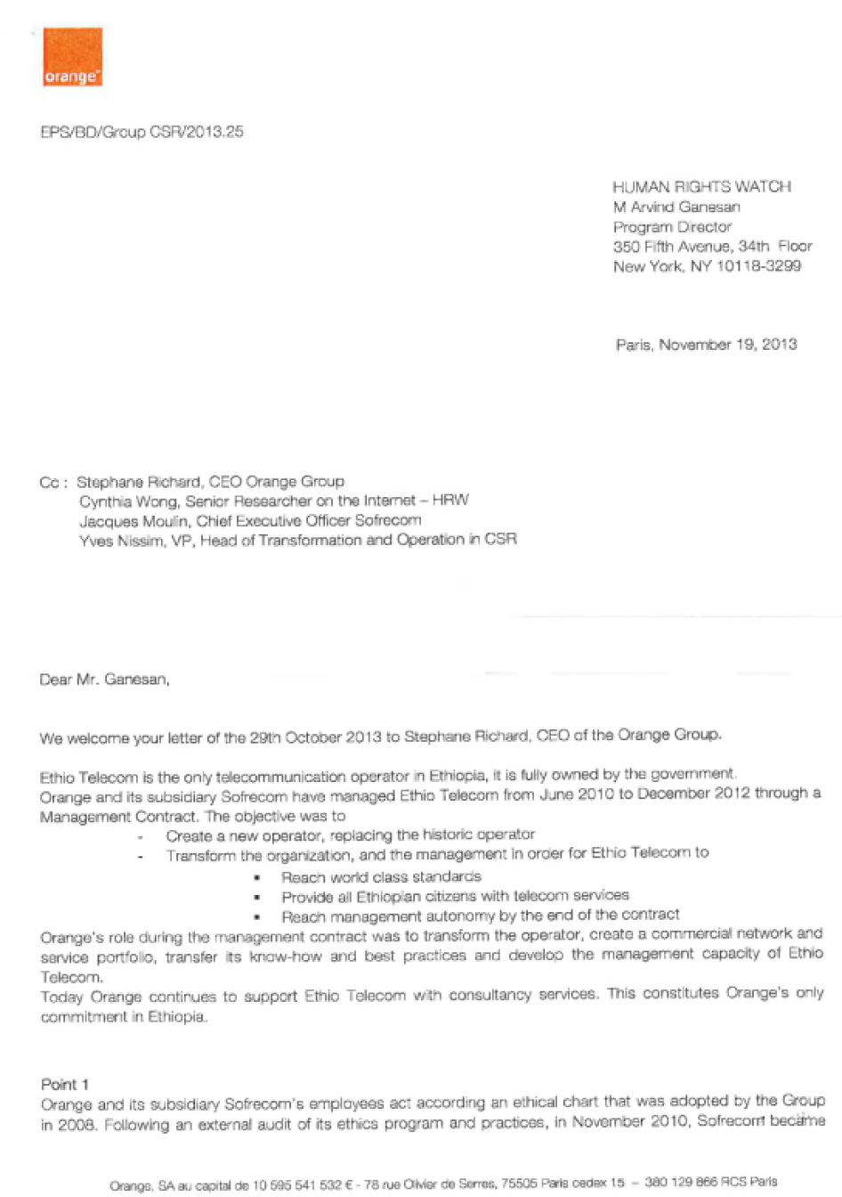Letter from Mr. Yves Nissim, Orange to Human Rights Watch
