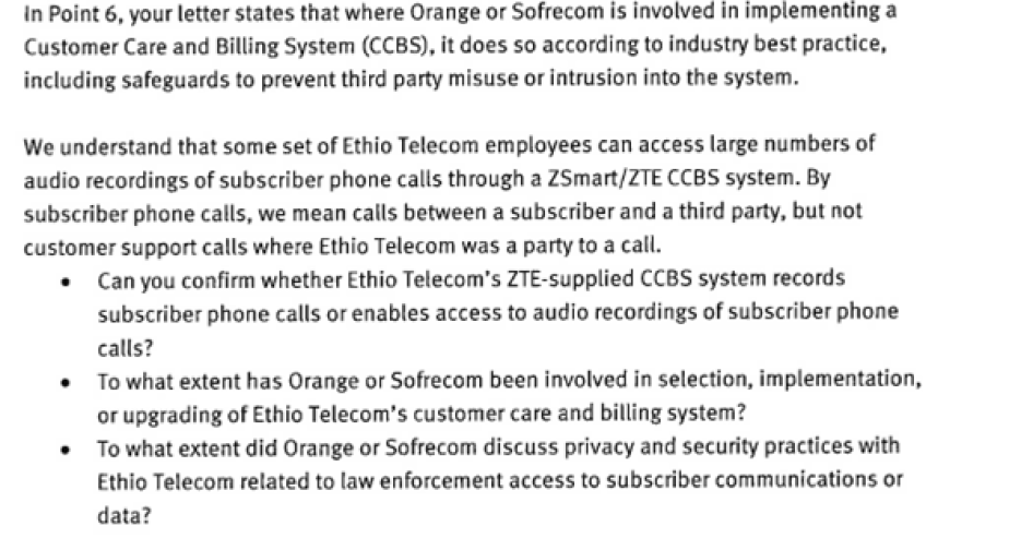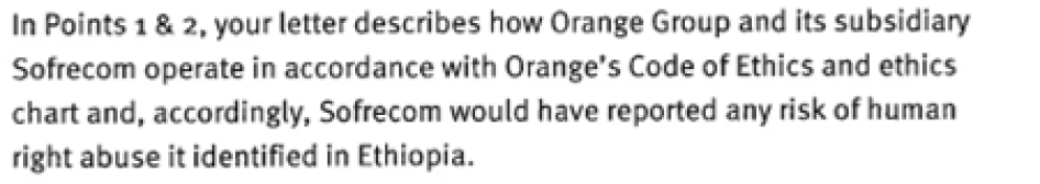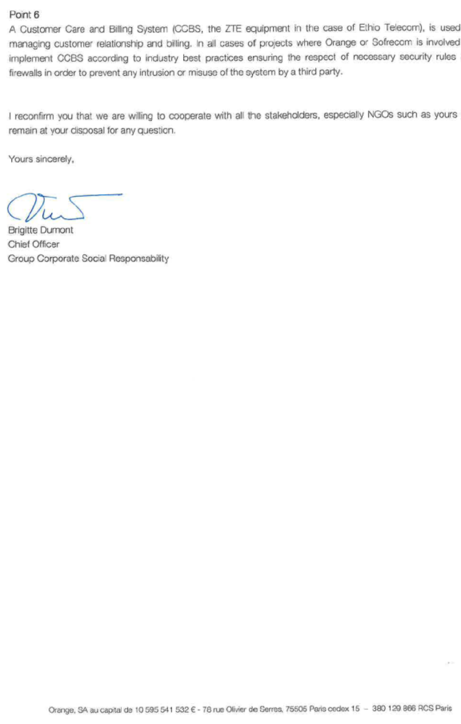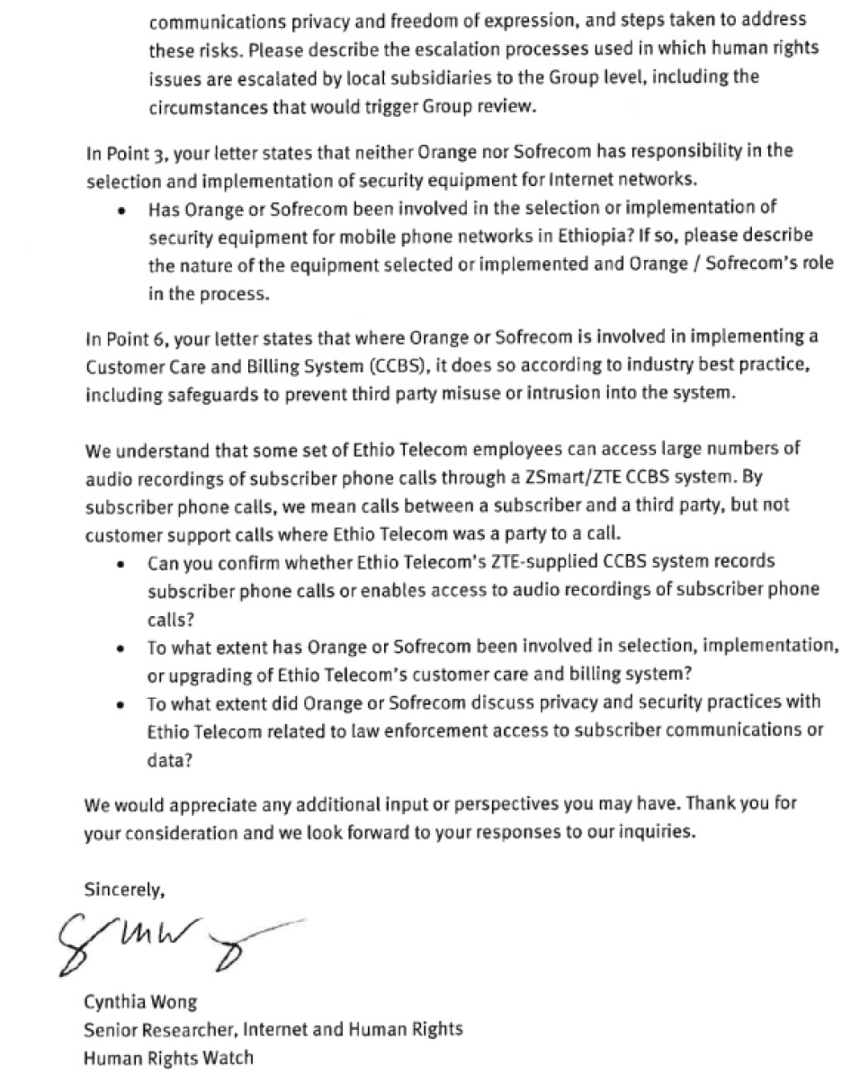 Letter from Ms. Brigitte Dumont, Orange to Human Rights Watch