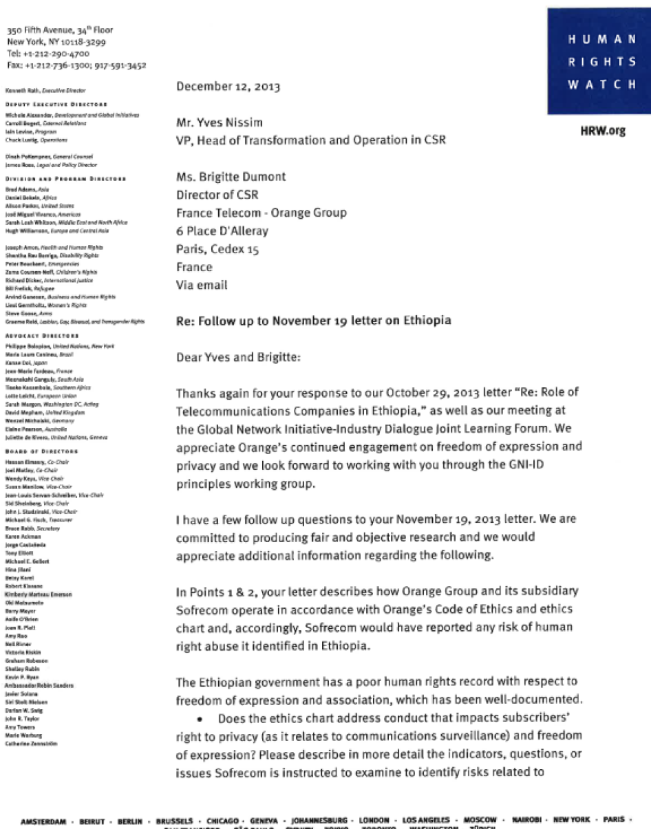 Human Rights Watch Letter to Mr. Yves Nissim and Ms. Brigitte Dumont, Orange