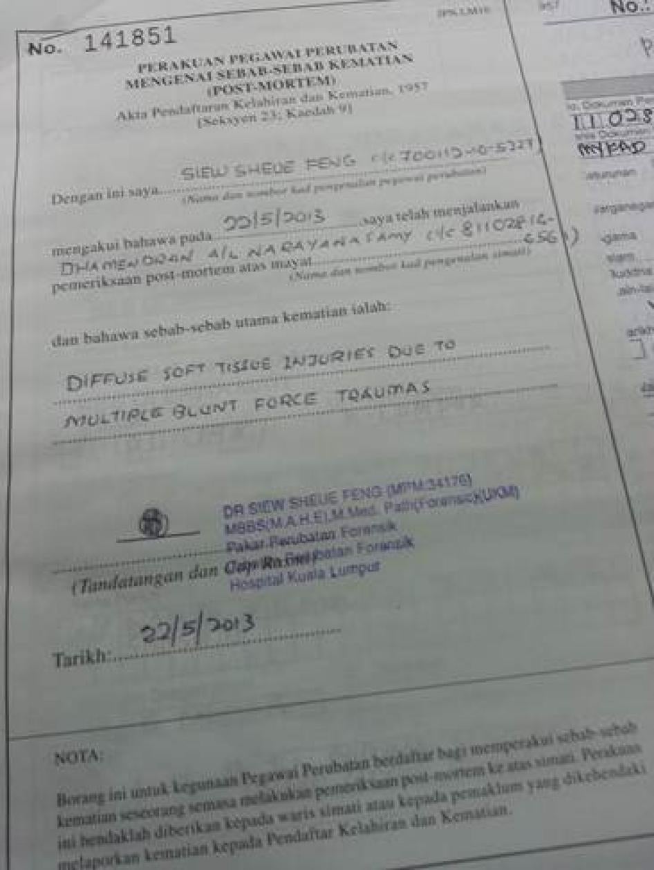 The cases we investigated also indicate that ill-treatment of persons in police custody in Malaysia remains a serious concern, and there is little recourse for those who suffer the abuse. For example, Mohammad Rahselan, 18, was forced by the police to squat for an hour, do spot jumping, and “walk like a duck” with arms crossed and hands behind his ears at a police station in Kelantan. Car mechanic S. Mogan alleged that he was kicked, beaten on his feet with a hosepipe, and threatened with a gun by a police officer at a police station in Selangor who was trying to induce him to confess to theft of a truck. Mogan filed a complaint, which the police disputed. When the wife of truck driver Dhamendran Narayanasamy visited him in police custody on May 19, 2013, he told her that he had been beaten in custody but “not serious” – two days later, he was dead from what the initial post-mortem found were “diffuse soft issue injuries due to multiple blunt force traumas” that occurred while in police custody.