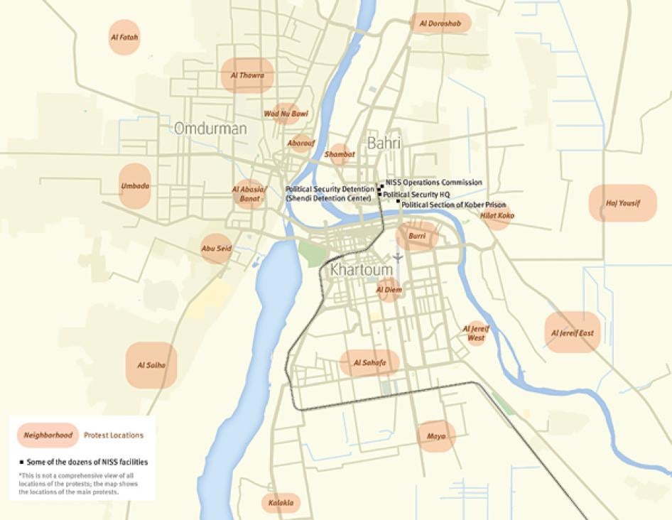 Many others, including youth activists, political party members, journalists, and human rights defenders were arrested because of their perceived anti-government views and role in organizing the demonstrations and were never legally charged. Former detainees reported a common pattern of being arrested often at night from their homes, taken to the nearest NISS office and interrogated, then transferred to a detention facility, either in a NISS building or in the NISS-run wing of a prison in various locations around Sudan. They were held in locations across the country for periods ranging from a few days to weeks or months.[43]