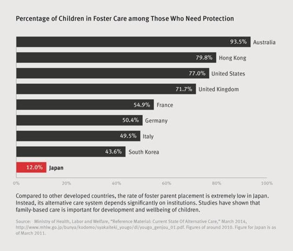 Japan’s foster care system also has problems. Information collected by the government’s child abuse reporting system for children in alternative care shows that the percentage of abuses by foster parents is higher than abuses recorded among children in an institutional environment. There are a few cases in recent years in which children died in foster parent care.