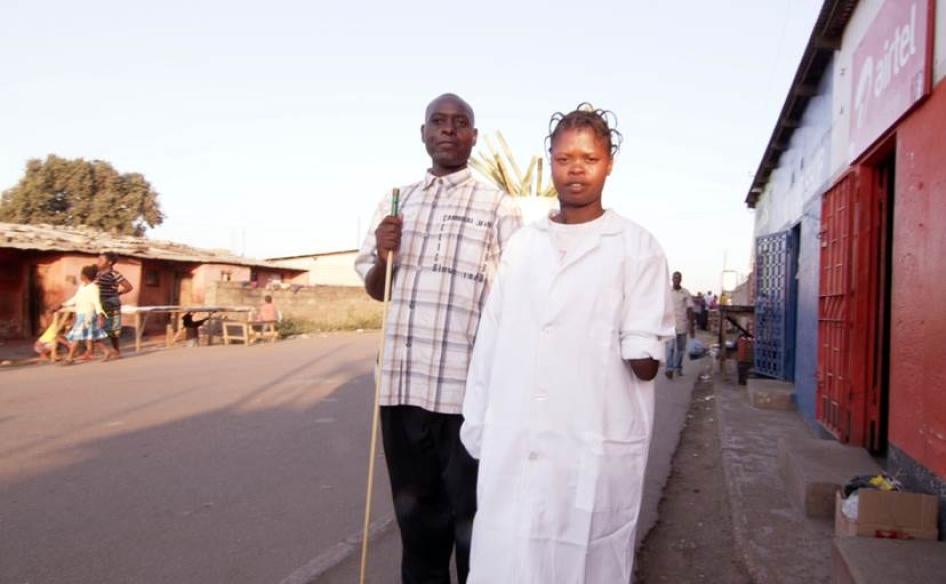 Dominic Vwalya (left), who is blind and living with HIV, is accompanied here by a volunteer health worker to a local health center in Lusaka. © 2014 Justin Purefoy for Human Rights Watch