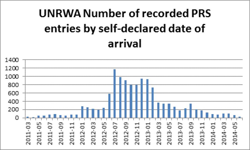 In spite of Jordan’s ban on entry to Palestinians, over 14,000 have entered Jordan since the start of the conflict, seeking support from the United Nations Relief and Works Agency for Palestine Refugees in the Near East (UNRWA).[23] Of these at least 12,700 reported entering after Jordan began denying entry to Palestinians in April 2012.