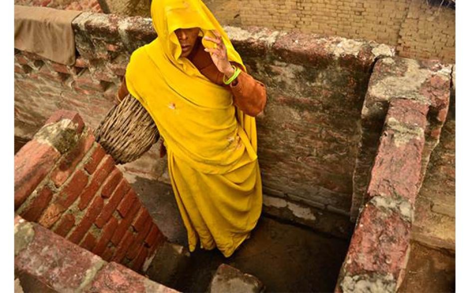 A woman cleans dry toilets in Kasela village in Uttar Pradesh, where the state has failed to enforce laws prohibiting manual scavenging. © 2014 Digvijay Singh