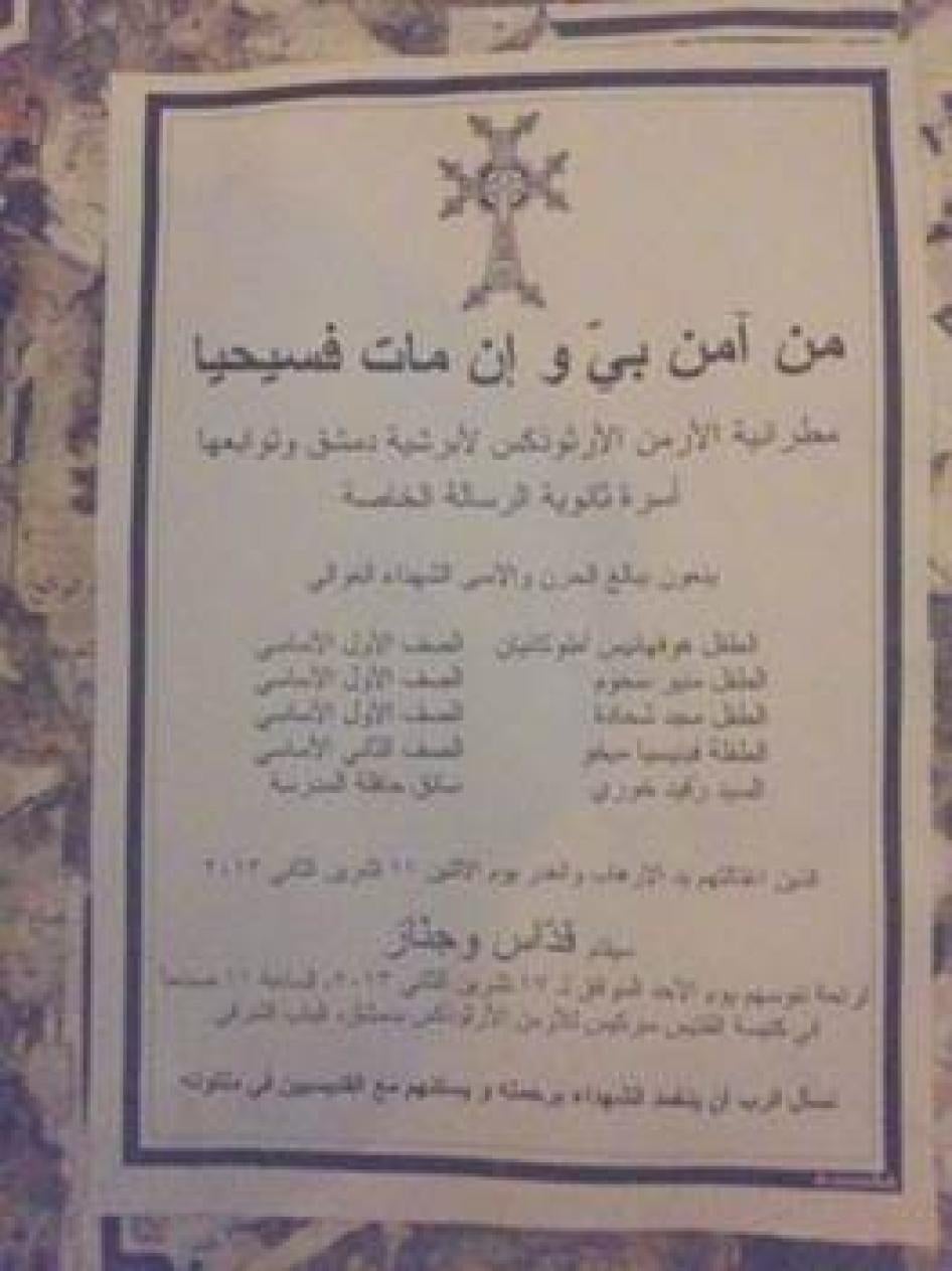 Um Samer Habash was killed with her granddaughter in their home. Hani Abu Bakr was killed and Mazen al-Sahnawi, who was newly married, was also killed. There was also a woman and her daughter, who was about 14, from Homs that were killed. They were standing on the street and died right away…. One Christian person was also killed… One of the men, Mazen was getting people off the street [because of the earlier IED], otherwise the outcome would have been much worse.[34]