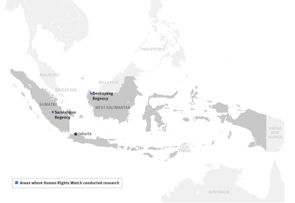 Human Rights Watch focused on the plantation operations of two companies—PT Ledo Lestari in Bengkayang regency of West Kalimantan province, and PT Sari Aditya Loka 1 in Sarolangun regency of Jambi province. Both of these oil palm plantations have had a devastating impact on the rights of two groups of Indigenous peoples: the Ibans—a subgroup of the Dayak peoples indigenous to Borneo (Kalimantan), and the Orang Rimbas—a semi-nomadic, forest-dependent Indigenous people in central Sumatra.