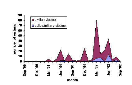 Proportion Of Military To Civilian Victims By Perpetrator Group from September 30, 2000 - August 31, 2002