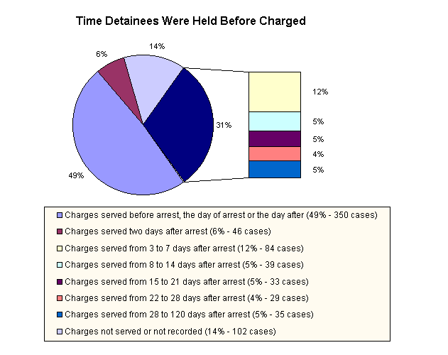 Many "special interest" detainees have been held without charge for longer than forty-eight hours. Using the information released by the Department of Justice in January 2002 and updated in February, we have compiled a graph summarizing the length of time 718 "special interest" detainees were held before charges were filed.183 The Department of Justice has not released any subsequent updates to that information. In 49 percent of the cases, the INS served a charging document to the detainee before the arrest, the day of the arrest, or one day after. In 6 percent of the cases, charges were served two days after the arrest.184 In 31 percent of the cases, charges were filed three days after the arrest or later. One-hundred and thirty-six non-citizens were held for more than a week without charge, sixty-four of these were charged only three weeks after their arrest or later, and thirty-five detainees were held from one to three months without charge. For instance, a Saudi Arabian was charged with falsely saying that he was a U.S. citizen only 120 days after his arrest and a Jordanian was held for 113 days without charge and finally accused of overstaying his visa.