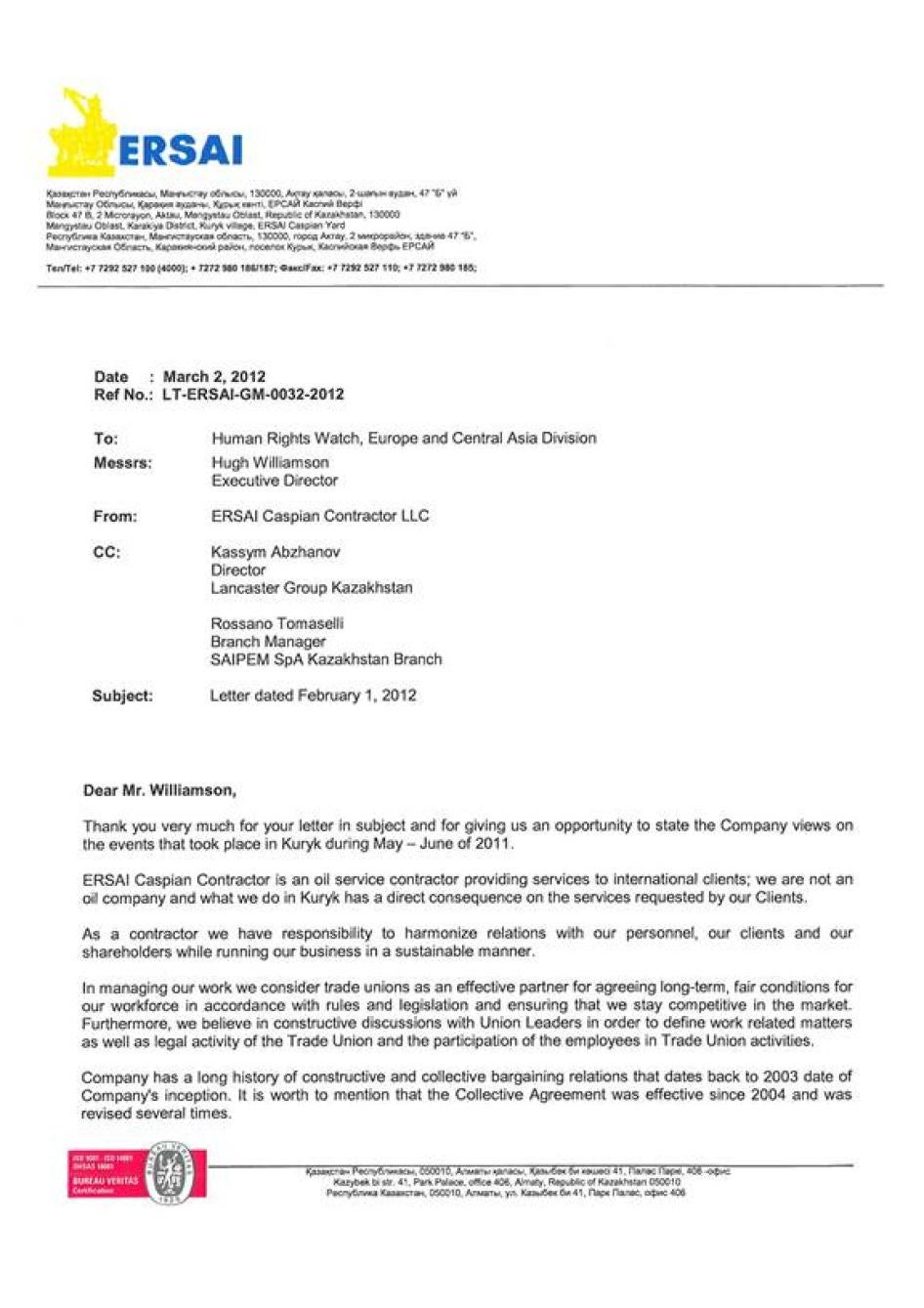 [348] Письмо генерального директора «ЕРСАЙ Каспиан Контрактор» Камилло Черезы Хьюман Райтс Вотч от 2 марта 2012 г.