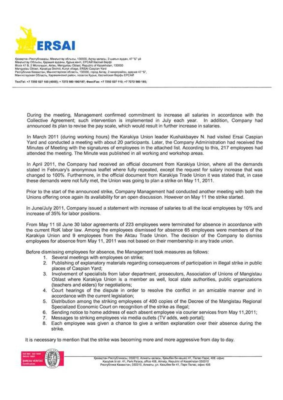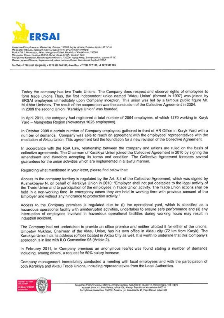 Менеджмент ЕРСАЙ сообщил Хьюман Райтс Вотч, что «в компании существует многолетняя история конструктивных и коллективных переговорных отношений» и что она «уважает и соблюдает права работников на создание профсоюзов». В компании утверждали, что пытались встречаться с профсоюзом «Каракия» до начала забастовки, однако оставили без комментариев утверждения о том, что членов этого профсоюза вызывали, опрашивали и притесняли после профсоюзного собрания в марте 2011 г.