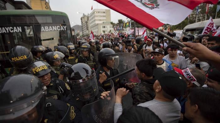 On December 7, then-President Pedro Castillo announced the temporary dissolution of Congress and the “reorganization” of the judiciary, in what was effectively an attempted coup. In response, Congress approved Castillo’s removal and Vice President Dina Boluarte assumed the presidency. At least 22 people were killed during protests calling for early elections.