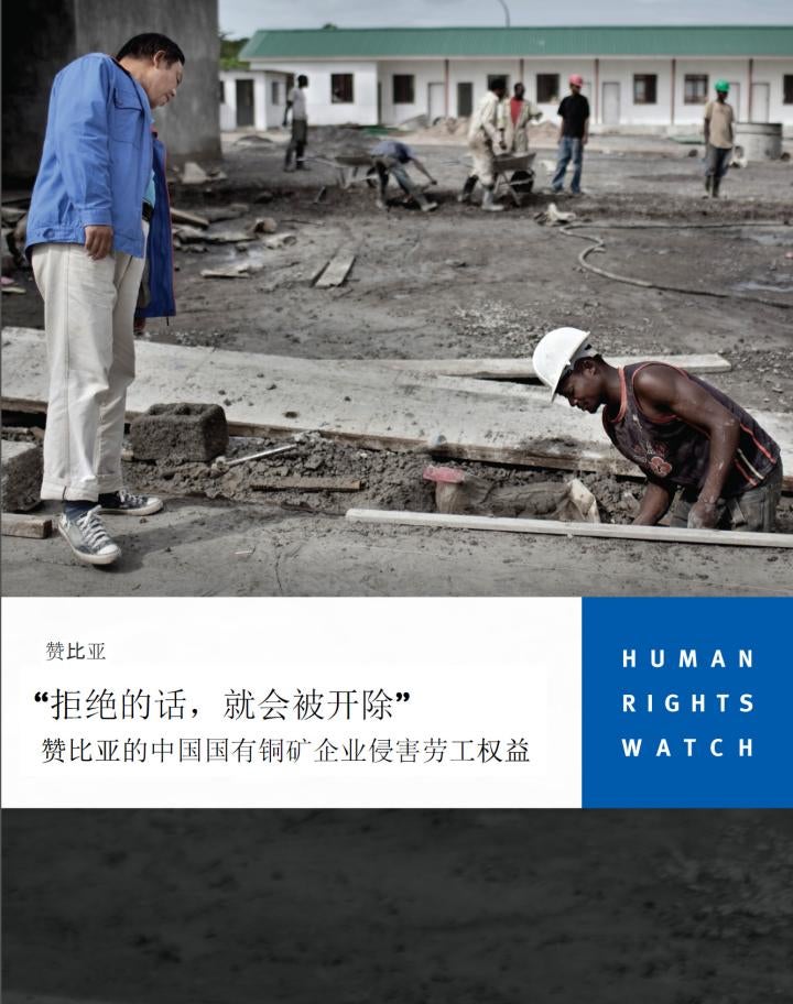 这份长达122页的报告《“拒绝的话,就会被开除”:赞比亚的中国国有铜矿企业侵害劳工权益》(‘You’ll Be Fired If You Refuse’: Labor Abuses in Zambia’s Chinese State-owned Copper Mines)详述了中国国有矿场内持续不断的侵权行为,包括:恶劣的卫生及安全条件;定期实行的12小时甚至18小时的工作制,而且工作艰苦;反工会行为。这些行为均触犯了赞比亚的国家法律或国际劳动标准。赞比亚的四家中国国有铜矿企业是中国有色矿业集团有限公司(China Non-Ferrous Metals Mining Corporation,CNMC;简称中国有色集团)旗下的附属公司,而中国有色集团亦为国有企业,直接由中国最高执行机构所监督管理。铜矿产出口占赞比亚所有出口将近75%,以及中央财政收入的三分之二,是赞比亚的经济命脉。
